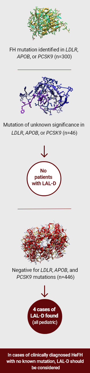 From a group of 446 patients with clinically diagnosed HeFH and no known mutation, 4 cases of LAL-D were found