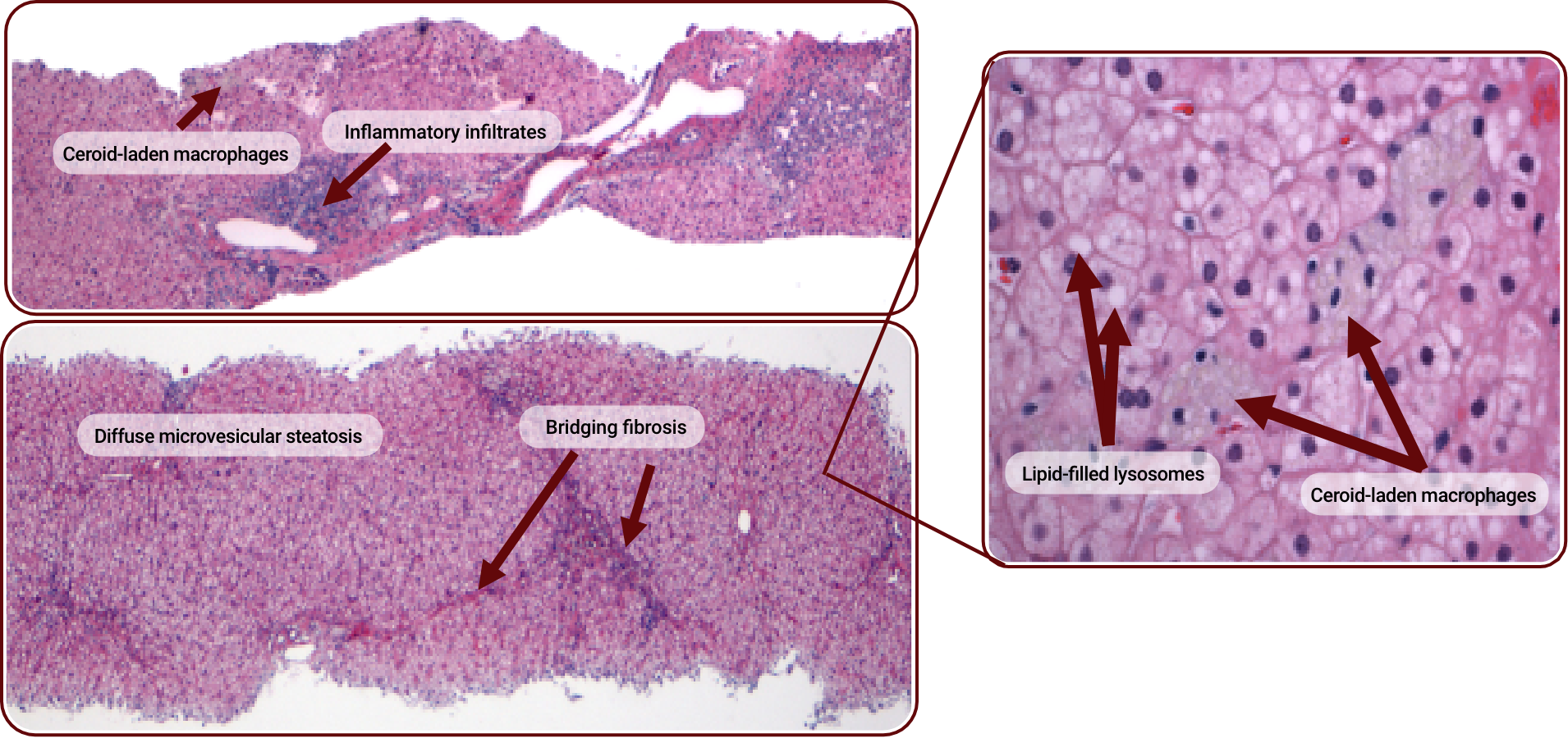 PATHOLOGIC FEATURES OF LAL-D ON LIVER BIOPSY CAN INCLUDE MICROVESICULAR OR MIXED STEATOSIS, FIBROSIS, AND/OR CIRRHOSIS1-3
