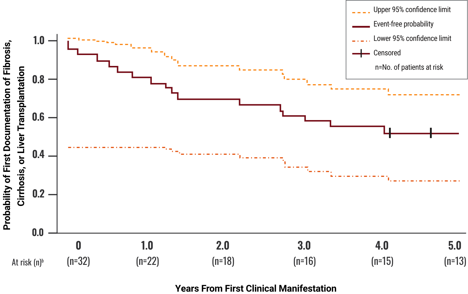 b“At risk” numbers aligned with the x-axis indicate the number of patients who have not yet had a documented occurrence of hepatic fibrosis, cirrhosis, or liver transplantation.